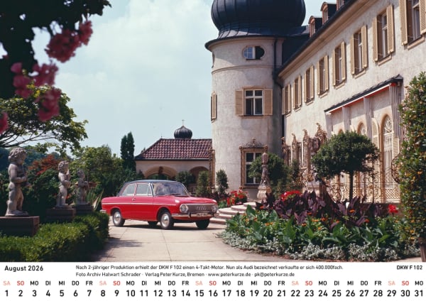 Der vom Bremer Autor Peter Kurze für den Auto Union Veteranen Club (AUVC) herausgegebene Kalender 2026 erinnert an die DKW-Automobile der 50er- und 60er-Jahre, die die Auto Union in Ingolstadt produzierte.