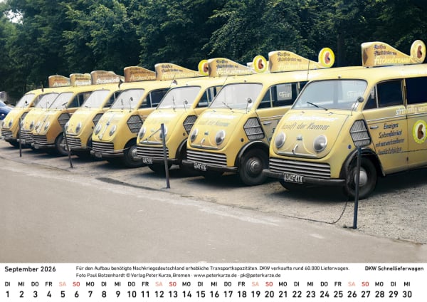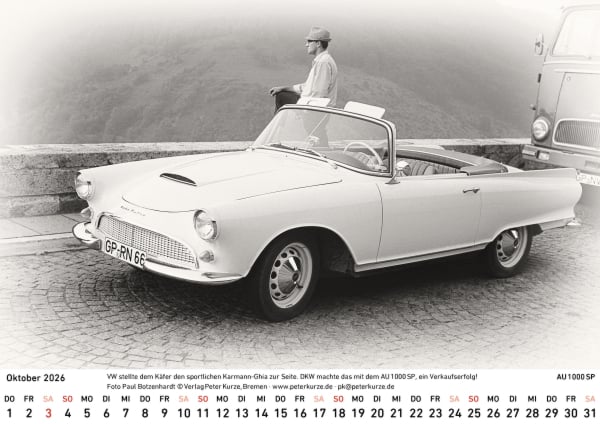 Der vom Bremer Autor Peter Kurze für den Auto Union Veteranen Club (AUVC) herausgegebene Kalender 2026 erinnert an die DKW-Automobile der 50er- und 60er-Jahre, die die Auto Union in Ingolstadt produzierte.